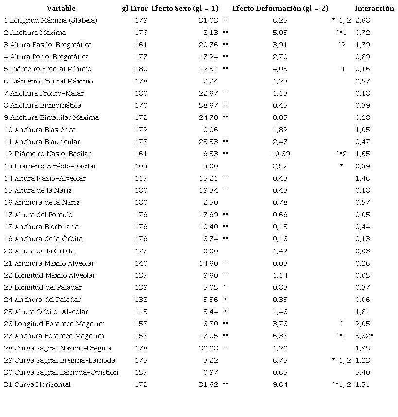 Para evaluar las diferencias entre sexos y la deformación artificial en individuos de edad posreproductiva se efectuó un ANOVA de dos vías (sexo-deformación), y para analizar los cambios fenotípicos entre las diferentes clases de edad se realizó un ANOVA de una vía empleando como covariantes el sexo y la deformación artificial (Sokal y Rohlf, 1979). Los cálculos estadísticos se realizaron con el programa InfoStat®.