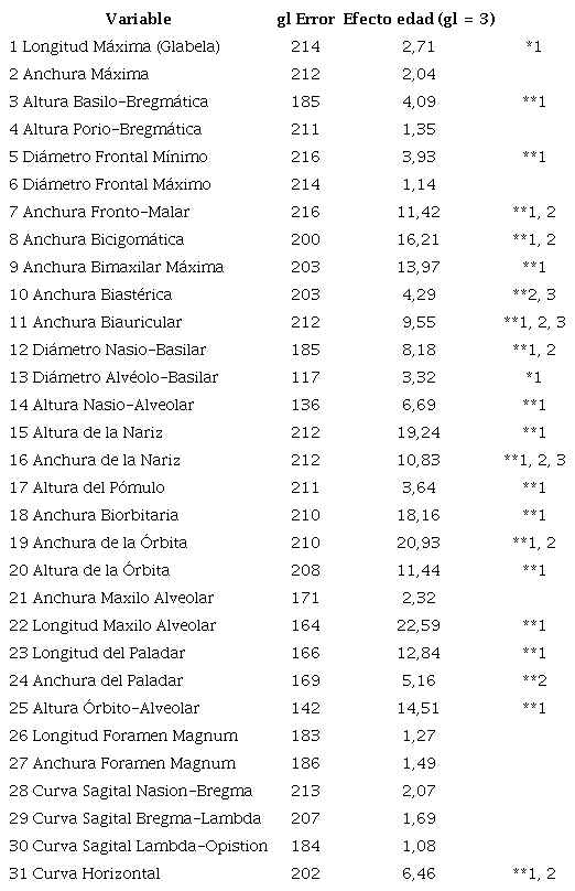 El análisis de la variación morfológica entre los diferentes grupos de edad en la población de Pucará de Tilcara mostró que los caracteres cambian significativamente durante el crecimiento de los individuos. A priori se habían planteado los siguientes contrastes: 1) Pre-reproductivos vs. Pos-reproductivos, 2) Adultos vs. Adultos maduros + Seniles, 3) Adultos maduros vs. Seniles. De las 22 variables que dieron diferencias significativas, 13 de ellas respondieron significativamente al primer contraste; por ejemplo, la longitud máxima y la anchura bimaxilar máxima (véase Tabla 5).