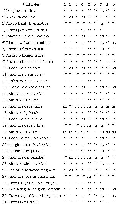 En el análisis para evaluar las diferencias entre sexos y deformación artificial del cráneo se observó ausencia de interacción en 29 de las variables estudiadas, esto permite considerar ambos efectos independientemente: la práctica deformatoria utilizada en la niñez no altera la apariencia sexual adulta y las diferencias entre individuos deformados y no deformados no dependen del sexo de los mismos. El dimorfismo sexual es el principal factor de variación intrapoblacional (24 de 31 variables evidencian cambios significativos); se destaca la ausencia de dimorfismo en la anchura de la nariz y la altura de la órbita, presentando el mismo comportamiento que otras poblaciones prehistóricas de Argentina, Chile y Bolivia. El efecto de la deformación artificial del cráneo se observa en diez variables relacionadas con la base y principalmente con la bóveda (véanse Tabla 4 y Figura 2).