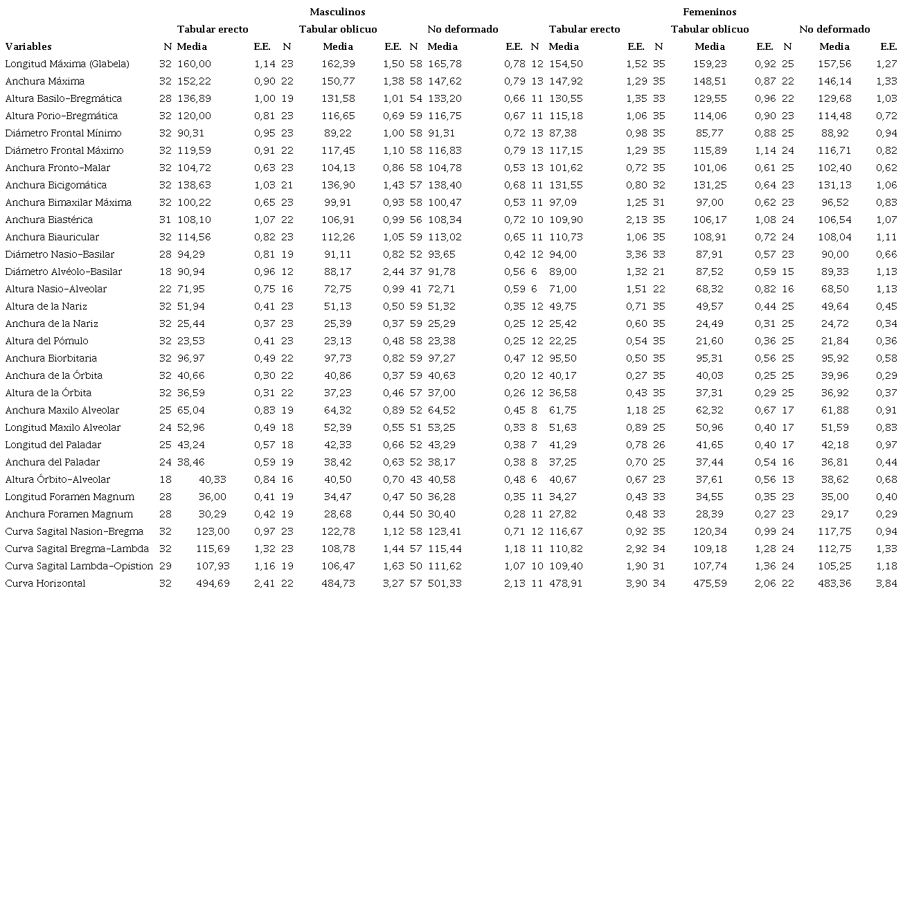 El efecto de la deformación artificial del cráneo se observa en variables relacionadas con la base y principalmente con la bóveda. Esto coincide con los resultados obtenidos para San Pedro de Atacama, donde el efecto de la deformación tabular (erecta y oblicua) se evidenció en la bóveda, cara y base del cráneo, produciendo una disminución en las longitudes e incremento en las anchuras de la bóveda (Varela, 1997). Asimismo, para Coyo Oriente, los valores medios de individuos deformados y no deformados reflejaron importantes diferencias con relación a la bóveda craneal y las anchuras de la base del cráneo, comprobándose efectos menores en el esplacnocráneo (Cocilovo y Zavattieri, 1994). En el caso de la población prehispánica de la puna de Jujuy, se comprobó que la mayoría de los individuos presentaban deformación tabular oblicua (56%), el resto de los individuos no estaban deformados (34%) y algunos individuos presentaban deformación tabular erecta (6%) y circular oblicua (2%). El efecto de la deformación sobre la morfología craneana se manifestó principalmente en la bóveda y en la base del cráneo, y en menor medida en la porción facial (Fuchs, 2014; Miranda De Zela y Fuchs, 2019).