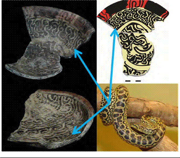 En estos sitios TPA de palafitos, el elemento iconográfico que destaca es la presencia de diseños curvos negros en forma de ganchos que encajan entre sí. Todo el borde de estas vasijas policromadas está pintado de rojo. La figura 5 muestra estos mismos ganchos en la piel de la anaconda. Esta iconografía es recurrente en casi todos los sitios de palafitos. Aunque abstracta, la iconografía tiene un orden de lectura en bandas horizontales, llenando todo el espacio interno de la vasija. Esto podría estar relacionado con lo que Gombrich (1999) llama “imagen conceptual”, es decir, la representación del dibujo estaría más asociada con el concepto que con el objeto mismo. El predominio del color negro podría corroborar la sugerencia de que estas imágenes corresponden a las manchas negras que la serpiente anaconda (Eunectes murinus) tiene en su espalda y podríamos, así como lo interpretó Roosevelt (2014) en su estudio sobre anacondas, asociarlas también a mujeres-chamanes. En este sentido, estamos de acuerdo con D. Ribeiro (1986) cuando explica que, “a la medida en que el arte expresa argumentos místicos, y en que define posiciones sobresalientes en la organización social, condensa y vincula diferentes esferas de la vida social, proporcionando la reproducción de la sociedad y de la cultura” (p. 10).