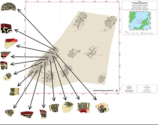 En el mapeo de dos de los asentamientos más grandes, Boca do Rio y Cabeludo, se recogieron cerámicas policromadas con las típicas líneas negras en forma de gancho, en las mayores concentraciones de pilares dentro del sitio (Navarro, 2018a). Esto corroboró el análisis de la jerarquía del espacio de las aldeas, interpretando estas zonas como plazas ceremoniales, mientras que las concentraciones menores de pilares, casi desprovistas de cerámica pintada, se consideraron como espacios domésticos, de residencia, es decir, malocas (véase Figura 6). Para ratificar aún más esta jerarquía, en el espacio central de la aldea, con la mayor cantidad de pilares, encontramos un adorno de jade en forma de rana, llamado muiraquitãs, cuya materia prima no existe en Brasil, habiendo sido posiblemente importada desde el Caribe (Navarro et al., 2017).