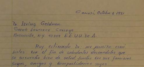 En su carta del 23 de junio de 1978, Correa le respondió a Goldman confirmándole su interés tanto en la colaboración como en apoyar a los estudiantes para lograr las metas asignadas. Adicionalmente, Correa le contó a Goldman que Silva y Rodríguez “consideraron que el plan es muy importante y que el hecho de que usted los haya invitado a ser parte del equipo de investigación les ha hecho alcanzar su meta de estudiar su cultura propia por sí mismos” (Goldman Papers, Caja 8, Serie 2, Questionnaire N.° 1). El acuerdo para realizar esta colaboración a distancia se completó el 14 de septiembre de 1978, cuando Goldman de manera entusiasta envió hojas de papel rayado, sobres, e instrucciones generales para hacer las entrevistas y escribir las respuestas del primer cuestionario con 22 preguntas, junto al cheque por $199,99 dólares americanos7 para retribuir a los “etnólogos indígenas en formación” (Goldman Papers, Caja 8, Serie 2, Questionnaire N.° 1) y para cubrir los gastos de envío del cuestionario por correo aéreo a Nueva York.