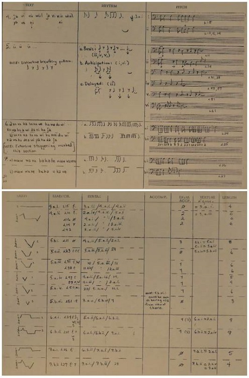 Roseman sabía, gracias a Goldman, que los Cubeo le dan mucho peso a la descendencia de sus ancestros a la hora de organizar los repertorios durante los ritos, así como al coordinar y liderar las voces del ensamble. Estas voces líderes correspondían a los especialistas rituales de alto rango dentro del sistema de parentesco cubeo. A partir de este “sistema de entradas”, Roseman identificó las similitudes entre los segmentos entonados en cada canción y la alternación de dichos segmentos, a través de una serie de variaciones durante la ceremonia grabada por Silva en los casetes de Goldman (Goldman Papers, Caja 2, Serie 1, Roseman Correspondence). Goldman parecía estar interesado en la teorización conceptual acerca de cómo la descendencia ancestral podía notarse a partir del sistema de entradas tal y como lo mencionó en una carta que le escribió a Roseman el 3 de febrero de 1979: “su prospecto tiene un alcance bastante amplio y promete producir un análisis innovador sobre la música de los Cubeo” (Goldman Papers, Caja 2, Serie 1, Cubeo Music Correspondence 1975-1978). Desde la perspectiva de Roseman, estas eran ideas en proceso y en repetidas ocasiones le pidió más información a Goldman, especialmente sobre los datos lingüísticos que podrían ayudar a elucidar el significado de las canciones, para corroborar la solidez de sus propios argumentos (Goldman Papers, Caja 2, Serie 1, Roseman Correspondence).