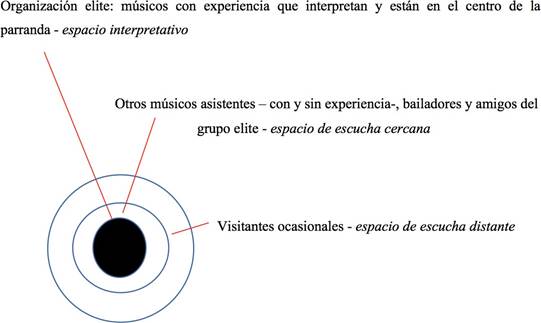 Inspirándonos en el diagrama planteado por Hitzler y Niederbache (citados en Mendívil y Spencer, 2016: 9), en una parranda observamos varios niveles de escucha y participación. Primero, en un círculo central se encuentran los músicos con capacidades interpretativas (maestros y aprendices). Ellos son quienes, al disponer los instrumentos, propician el encuentro de manera espontánea; son quienes constituyen la élite y conforman el espacio interpretativo central. En el círculo contiguo encontramos otros músicos, bailarines y amigos de la organización élite. Ellas y ellos asisten a disfrutar del performance de manera activa, implicándose en un alto nivel corporal y de escucha; esta zona se configura como el espacio de escucha cercana. Por último, en el círculo externo, se encuentran asistentes ocasionales: personas curiosas que disfrutan de la escena fugazmente, así como músicos y bailadores que quieren mantener distancia con el centro; este es el espacio de escucha distante (véase Figura 1).