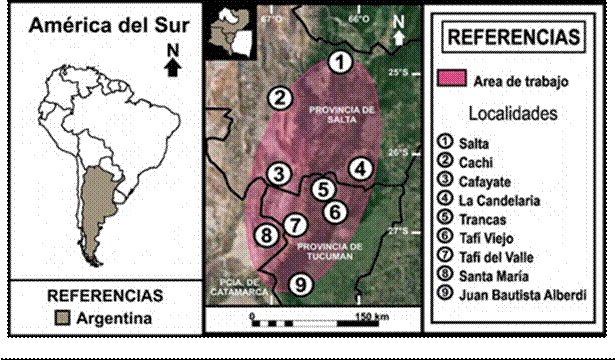 Nuestra área de estudio se localiza primariamente en el ámbito de las tierras bajas de la provincia de Tucumán y sus espacios adyacentes, como el valle Calchaquí y el de Santa María o Yocavil, en los que la distribución del estilo Candelaria se encuentra presente (véase Figura 1).