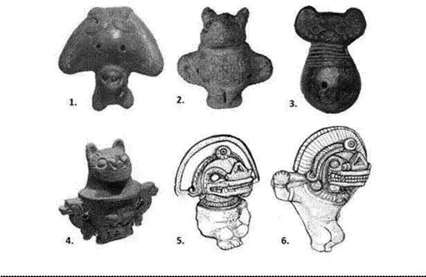 La figura del murciélago fue reconocida en dos instrumentos musicales del estilo Candelaria, ambos provenientes del sector oriental boscoso del área de trabajo. El primero es un silbato proveniente de La Candelaria (Salta), identificado con la sigla CYB-2, y el segundo es un sonajero proveniente de Tafí Viejo (Tucumán), identificado con la sigla MAC-10. Ambos instrumentos provienen de contextos funerarios (véase Figura 5).