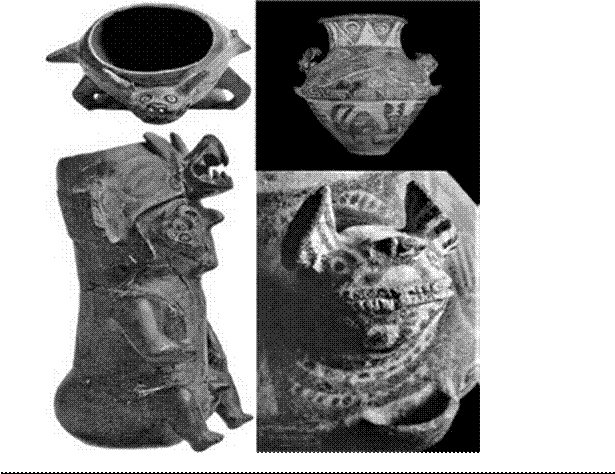 La presencia de murciélagos es recurrente en la iconografía del estilo Aguada (González, 1998; Laguens y Gastaldi, 2008). Según Llamazares (2006: 69), gran parte de la iconografía del periodo puede considerarse como arte chamánico o visionario, el arte de Aguada “es profuso en imágenes de personajes antropomorfos, felinos, serpientes, aves, saurios, vampiros y una multiplicidad de figuras geométricas”. González (1998) reporta la presencia de un murciélago sobre el tocado cefálico de un personaje modelado en un vaso del estilo Ambato negro grabado proveniente de Villa del Portezuelo (Catamarca). Por otra parte, en González (2007) se observan dos ejemplares modelados sobre el cuerpo de una vasija santamariana proveniente de Pueblo del Molino, Corral Quemado (Catamarca). En el modelado de sus figuras, estas fueron pintadas con formas circulares, las cuales podrían ser interpretadas como las manchas del pelaje de un felino (véase Figura 4).