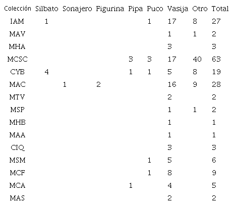 Con la información obtenida a partir de este análisis, se elaboraron fichas de registro del material cerámico, en las cuales se contemplaron aspectos tales como: número de pieza, forma (silbato, sonajero, figurina, pipa, puco, vasija, otro), medidas (alto y largo máximos), pasta (cocción, textura), cuerpo (base, asa, cuello), superficie (adherido, modelado, pintado, inciso, grabado), tratamiento (engobe, alisado, pulido, bruñido), número de la base de datos personalizada, número de registro de la colección, procedencia, motivos y observaciones. Estos datos fueron considerados con el fin de contextualizar el soporte sobre el cual se realizaron las representaciones.