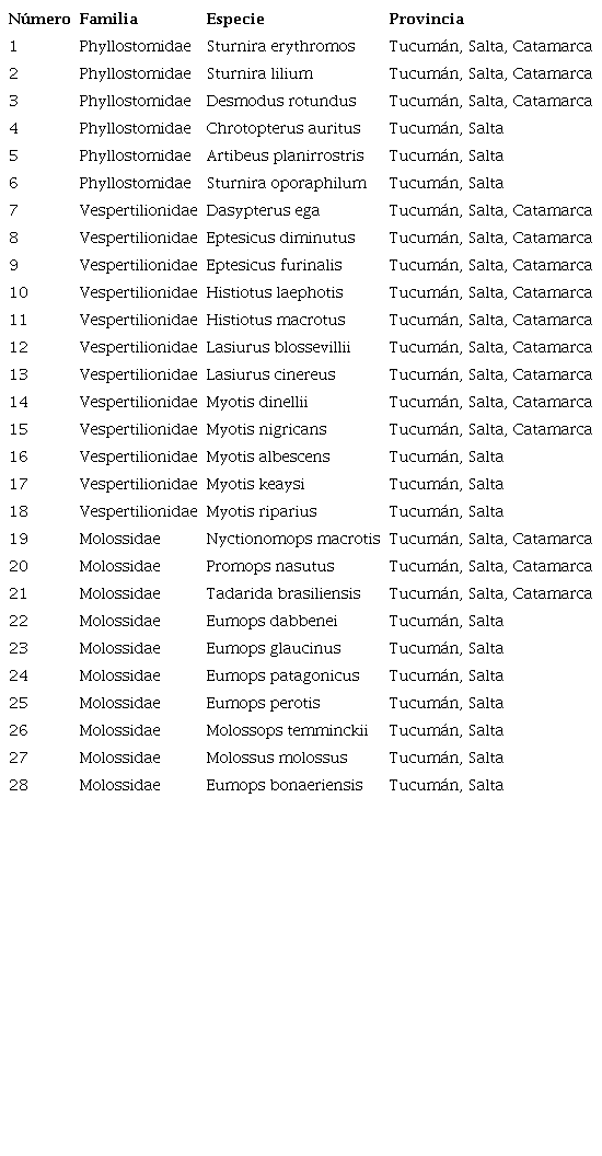 Los murciélagos son un grupo importante de mamíferos, con gran diversidad de especies y abundancia en diferentes ecosistemas (Barquez y Díaz, 2009; Barquez, Mares y Braun, 1999; Herrera et al., 2015). En todo el mundo se conocen más de 1.100 especies, agrupadas en el orden Chiroptera (Herrera et al., 2015). Este orden está compuesto por dos subórdenes: Megachiroptera y Microchiroptera, este último presente únicamente en América. En la actualidad se reconocen para Sudamérica 9 familias, 74 géneros y aproximadamente 250 especies (Barquez y Díaz, 2009). La fauna argentina de murciélagos está compuesta por 60 especies distribuidas en cuatro familias: Noctilionidae, con 1 género y 2 especies; Phyllostomidae con 14 géneros y 18 especies; Vespertilionidae, con 5 géneros y 22 especies; y Mollossidae, con 7 géneros y 18 especies (Barquez, Diaz y Ojeda, 2006; Barquez, Mares y Braun, 1999).
