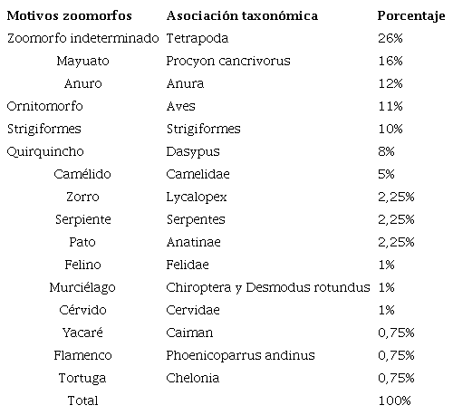 Como resultado del análisis de las 176 piezas se pudieron identificar 202 motivos distribuidos de la siguiente manera: 133 motivos zoomorfos (65,86%); 27 motivos híbridos (13,36%); 26 motivos antropomorfos (12,87%); 11 motivos fitomorfos (5,44%) y 5 otros motivos (2,47%). Los taxones identificados dentro de los motivos zoomorfos se detallan a continuación (véase Tabla 4). En el caso particular del total de los motivos híbridos, se identificaron las siguientes combinaciones: antropomorfo/zoomorfo indeterminado (29%); antropomorfo-ornitomorfo (29%); mayuato-ornitomorfo (11%); antropomorfo-camélido (7%); antropomorfo/zoomorfo indeterminado/ornitomorfo (4%); antropomorfo-mayuato (4%); antropomorfotortuga (4%); antropomorfo-strigiformes (4%); zoomorfo-indeterminado/zoomorfoindeterminado (4%) y tapir-ornitomorfo (4%).
