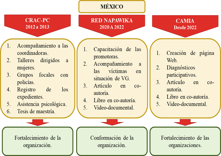 Tomando en cuenta el objetivo de las organizaciones, mi co-labor también incluye la asistencia y acompañamiento psicológico a víctimas en situación de violencia de género. Por ejemplo, en la Policía Comunitaria de Guerrero me brindaron un espacio para asistir psicológicamente a los comunitarios (policías de la organización), detenidos y mujeres denunciantes. En el caso de la Red de Mujeres Rarámuri también acompañé los procesos de canalización a distintas instituciones. En ambas organizaciones me comprometí a respetar el principio de confidencialidad y no insertar en los productos académicos (tesis, capítulos o artículos) ningún testimonio de los casos atendidos.