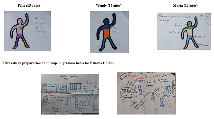 Los jóvenes compartieron una representación de su repertorio lingüístico a través de un retrato lingüístico que aportó información sobre las lenguas habladas y sobre aquellas en el entorno y espacio frecuentado por ellos. Sin embargo, elegí profundizar la representación de sus movilidades a través de cartografías colaborativas, dibujadas a partir de la percepción del joven sobre su recorrido migratorio.