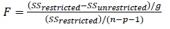 em que SS são as somas de quadrados dos resíduos, obtidas diretamente das tabelas de ANOVA de regressão; g é o número de coeficientes que foram zerados (restrições) em H0; n é o tamanho da amostra efetivamente utilizado nas regressões, já descontadas as observações perdidas por defasagens; e p a quantidade de coeficientes das variáveis defasadas em H1.