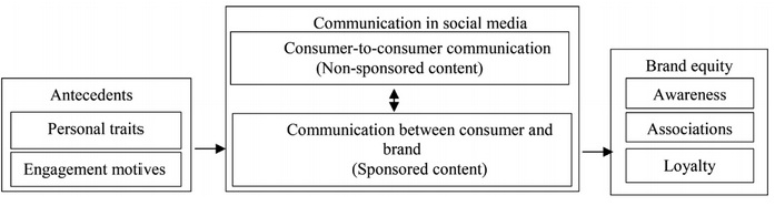Regarding the interaction and communication through SM, there is a research by Zailskaite-Jakse and Kuvykaite (2016) that display in a simple diagram how the personal traits of a person together with his motives are related to the communication in social media, then, how this communication can enhance the brand equity through awareness, associations, and loyalty. Also, the culture in this framework would be part of the antecedents, with personal traits and engagement motives.