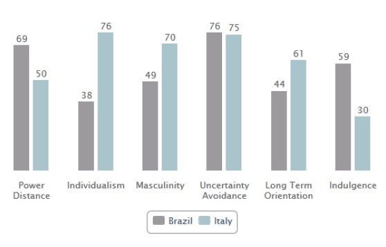 Considering the cultural aspect developed by Geert Hofstede (2001) it is possible to observe some differences between Italy and Brazil. Hofstede (2001) characterize culture into six main dimensions: