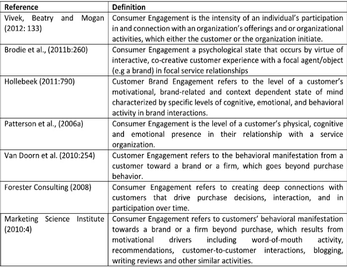 Even though there is an increasingly amount of interest on this topic, research on consumers’ engagement is still at a nascent stage (Schultz & Peltier, 2013), thus empirically based studies are scarce. Regardless the stage of academic studies, consumer brand engagement (CBE) is emerging as a central topic when developing a brand strategy in businesses due to its importance when developing brand loyalty, trust, satisfaction, and commitment (Lujja & Ozata, 2017). There are several definitions of CBE: the one used in this study is that CBE is as an ongoing emotional, cognitive, and behavioral investment in specific brand interactions (Hollebeek, 2011). Nonetheless, other scholars such as Bowden (2009) states that the CBE is as a psychological process that shapes the mechanisms by which customer relationship and loyalty forms for new customers as well as the mechanisms by which loyalty is maintained for repeat-purchase customers. As showed previously, many scholars have different definition, ranging from the creating deep connections with customers decision to the behavioral manifestation towards a brand, on Table 1 it is possible to observe the most important definitions developed so far.