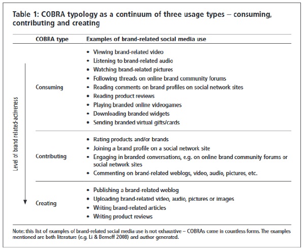 There is already some research regarding the influence of internet and its social media on consumer brand engagement. The most important is COBRA Theory, developed by Mutinga, Moorman and Smit (2011); this theory separates the activeness on social media use into three dimensions that demonstrate the path of involvement with band-related content. The categories are: