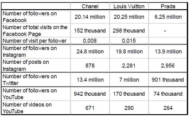 Regarding the presence of the three brands on SM, Chanel and LV have a larger presence on Facebook than Prada, however, LV have a greater number of visits per follower than Chanel. On Instagram, Chanel is to brand with the larger number of followers, but with the smallest number of posts, whilst Prada has the smallest number of followers and the highest number of posts. On Twitter, Chanel has almost the double of followers than LV, while Prada has a considerable small number of followers.