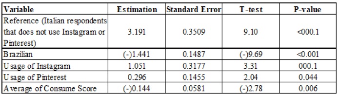 Model showed that there is a relationship with 5% of significance between the average of PDI and the inspiration by digital influencers. When the respondent does not feel inspired by digital influencers, the PDI grows by 0.167 in the score. If a person is from a group that has a higher acceptance of unequal power distribution within it, the higher is the chances that people inside that group will be inspired by digital influencers.