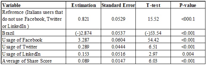 A raise of 1 unit in the Share score, leads to a raise of 0.089 in the LTS score. Even though it is a small raise, it is still significative. This means that the lower the contribution, the higher is the long-term view of the respondent. Taking into consideration the control variables, if the respondent uses Facebook, the average LTS score raises 3.287, if she or he uses Twitter, the score raises 0.289, and if the respondent uses LinkedIn, the score increases 0.153.