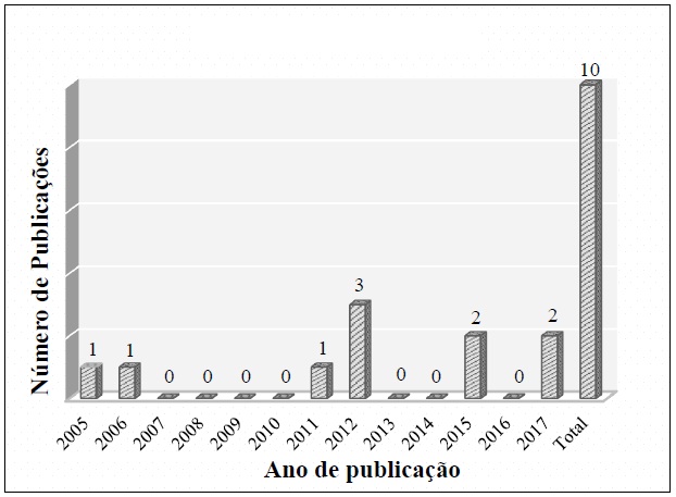 Através da busca nas bases de dados, encontrou-se 20 artigos completos referentes ao tema, entretanto, após leitura do conteúdo, dez desses foram excluídos, por não se adequarem rigorosamente aos critérios preestabelecidos. Assim, dez artigos primários compuseram a amostra final desta revisão. A Figura 1 mostra o número de artigos avaliados, de acordo com o ano de publicação. Observa-se a distribuição desigual dos estudos no período pesquisado. Ressalta-se um longo período sem publicações (2007-2010).