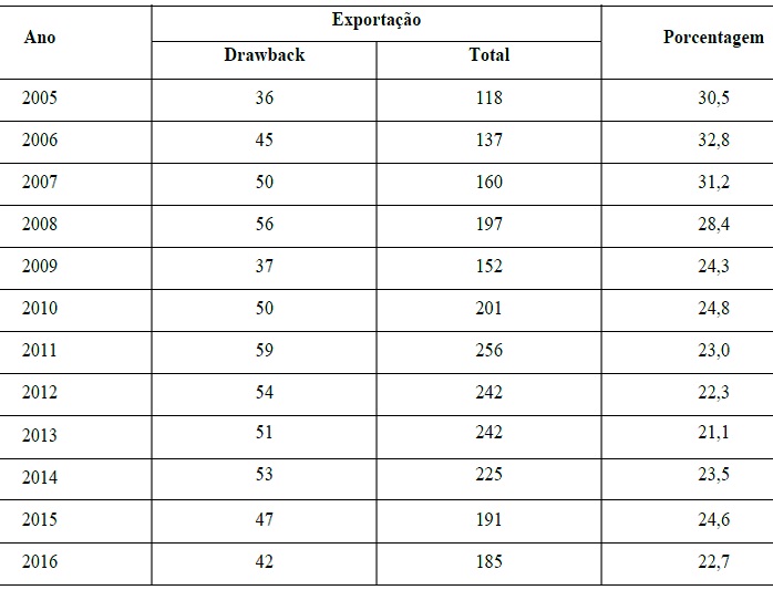 Quando comparados os dados do Portal Sixcomex relativos à participação do Drawback nas exportações brasileiras nos últimos 12 anos, observou-se que entre 2005 a 2007, a porcentagem de uso do Drawback foi superior a 30% no total das exportações. Contudo, a partir de então observou-se um declínio e desde 2010, a participação do regime não ultrapassou os 25% (Tabela 1).