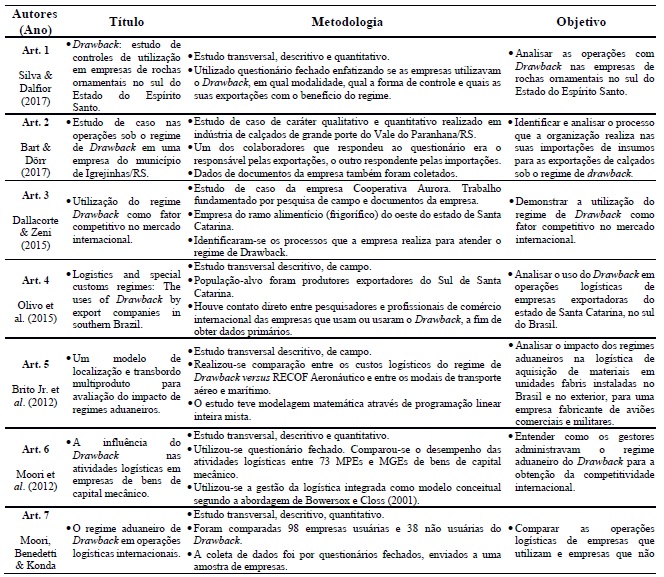 Os artigos incluídos nesta RI foram: estudos primários, publicados em português, inglês ou espanhol, entre 2005-2017, disponibilizados em revistas on-line e na íntegra. Foram também utilizados dados consolidados do Drawback, disponibilizados on-line no Portal Sixcomex–RFB/SECEX. Foram excluídos: artigos de revisão, monografias, teses e pesquisas em idiomas diferentes do proposto ou fora do período estabelecido.