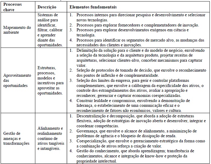 Teece (2007), com um propósito mais analítico, expandiu o conceito das Capacidades Dinâmicas organizacionais em diversos processos que mobilizam os recursos de uma empresa, os quais denominou “meta-Capacidades Dinâmica”. São os recursos humanos, com suas competências individuais, inseridos em uma estrutura organizacional (que possui história, cultura, etc.), que serão os principais atores internos. Tudo isso, tendo em vista que as Capacidades Dinâmicas são o “resultado” desta mobilização de processos, recursos e competências disponíveis na empresa e no seu ecossistema. Os processos chave das capacidades dinâmicas propostas por Teece (2007) são: