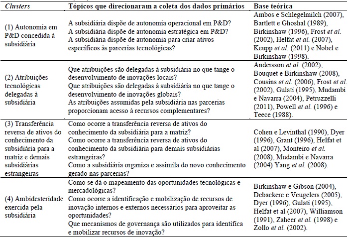 Miles e Huberman (1984) citam que, a análise de dados qualitativos em um estudo de caso complexo exige a utilização de técnicas que facilitem a compreensão, síntese e o devido sumário dos resultados e sugerem a criação de meta-matriz que possibilite sintetizar e agrupar os dados em clusters. Dessa forma, os dados da pesquisa foram sintetizados e agrupados em clusters, conforme sugerem Miles e Huberman (1984) e alinhados à (1) a autonomia em P&D concedida à subsidiária, (2) as atribuições tecnológicas delegadas à subsidiária, (3) a transferência reversa de ativos do conhecimento da subsidiária para a matriz e demais subsidiárias estrangeiras, e (4) a função de adaptação exercida pela subsidiária e (5) a função de alinhamento exercida pela subsidiária. Quanto ao protocolo de pesquisa adotado, destacam-se no quadro a seguir os clusters de análise e as perguntas de pesquisa, bem como a base teórica correspondente.