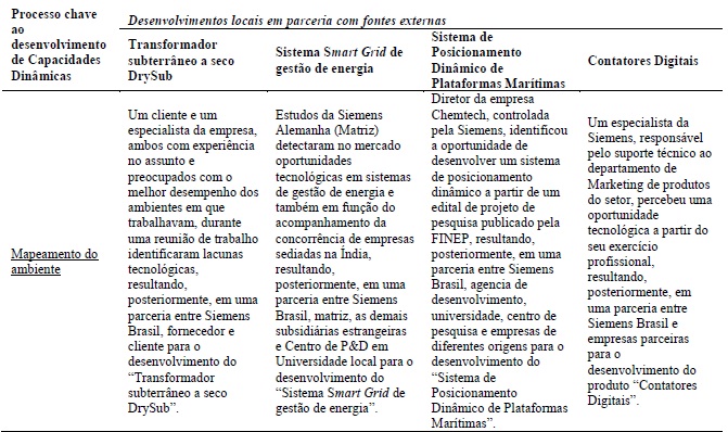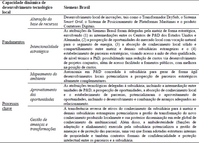 Com fundamento nas questões descritas na Tabela 2, foi realizada uma avaliação das capacidades dinâmicas de desenvolvimento tecnológico local da Siemens Brasil. Utilizou-se a conceituação de Teece (2007): os processos chave de mapeamento do ambiente, aproveitamento das oportunidades e gestão de ameaças e transformações.