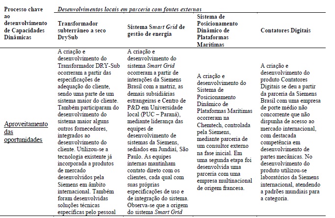 No que tange as interfaces externas para desenvolvimento e customização de produtos, a Siemens Brasil tem como principais parceiros a matriz alemã, as demais subsidiárias estrangeiras, as instituições científicas e tecnológicos (ICTs) locais que oferecem competências complementares, os fornecedores, os clientes, bem como empresas locais não concorrentes. Como exemplo, cabe destacar a implantação de um Centro de P&D no país para o desenvolvimento de produtos em parceria com Pontifícia Universidade Católica do Paraná (PUC-PR). Foram alocados trinta pesquisadores, incluindo estudantes e parceiros empresariais, envolvidos em desenvolvimento do núcleo básico de sistemas de energia. A PUC-PR fornece ainda as instalações e a infraestrutura onde são desenvolvidos os módulos de engenharia básica de alguns sistemas da Siemens Brasil, o que possibilita a troca mútua de conhecimentos, experiências, simulações e prototipagem entre a empresa e a universidade.