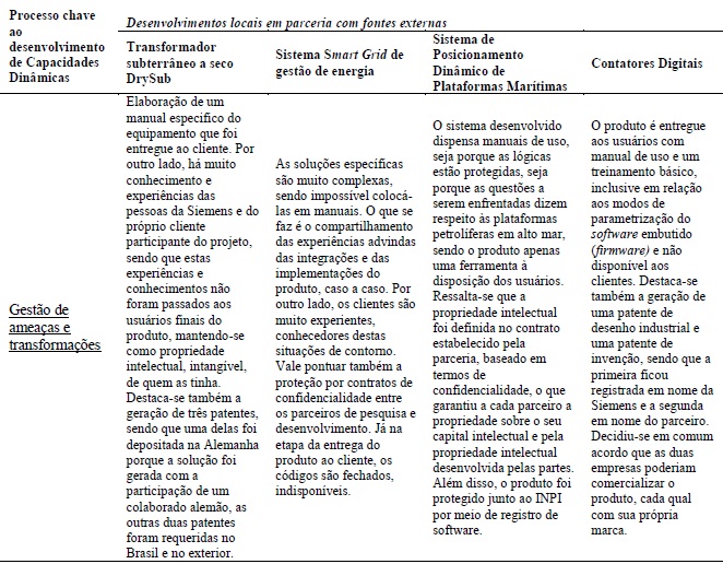As Tabelas 3, 4 e 5 apresentam (na vertical) os processos chave de desenvolvimento das Capacidades Dinâmicas como preconizado por Teece (2007). Já no plano horizontal, resumem as questões específicas sobre os produtos estudados, destacando as parcerias com fontes externas, tanto em relação à Matriz e a outras subsidiárias quanto em conjunto com empresas externas à corporação.