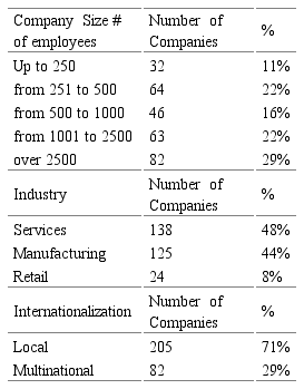 From the sample of 287 companies available in the database, the industry those firms operate were classified into two major groups: (i) manufacturing sector (44%), and (ii) companies providing services and trade (56 %). Regarding internationalization, it was observed that multinationals account for 29% of the database, and local companies for 71%. Size is explained in Table 2, as are the other variables. Size uses the number of employees as a proxy.
