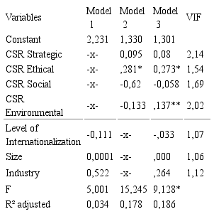In Table 4 is possible to see the lack of multicollinearity, seen through the VIF test with results that are lower than 5 (Maroco, 2003). Therefore, the regression confirms hypothesis H2 and marginally confirms H4. It also rejects H1 and H3. So, it is possible to stablish that strategic human resource management indicates actions towards ethic CSR. Comparing models 2 and 3, it is possible to see that the complete model has a more robust explain power.
