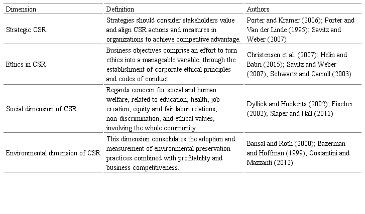 It is important to point out that CSR is understood as a broad concept, which can gather initiatives that are too different from each other. Hence, the relevance of analyzing the construct divided in dimensions that better explain the strategic movements adopted by companies. Therefore, we split the concept into four dimensions: (i) strategic, (ii) ethic, (iii) social, and (iv) environment.