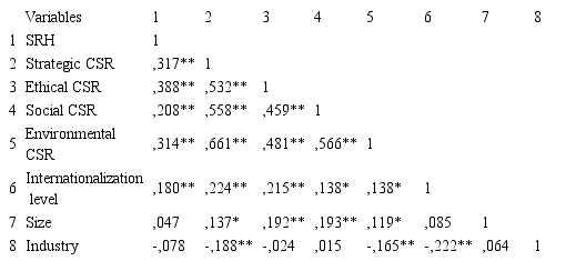 Our study sought to investigate the relationship between SHRM and CSR dimensions. Specifically, we analyzed the influence of SHRM in strategic, ethical, social and environmental CSR actions. In addition, we examined the effects of intervening factors such as internationalization, size and industry. The relevance of this study relies on association of the strategic human resource management with the advancement of corporate social responsibility, especially in the context of a developing country.