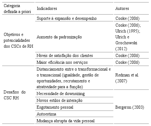 No presente caso, foram definidas a priori as categorias relacionadas ao papel do CSC RH propostas na literatura em relação à sua potencialidade e objetivos, assim como aos seus desafios, conforme a Tabela 1.