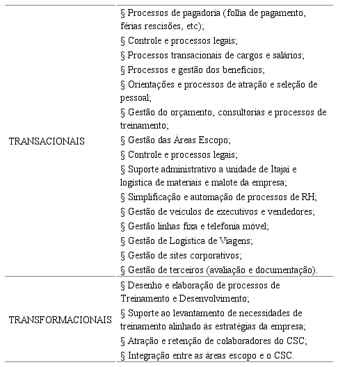 Os serviços compartilhados podem ser delineados em dois tipos: baseado em transações de serviços e transformação com base em serviços. Os serviços baseados em transações podem ser atividades relacionadas a benefícios; compensação/pagamento; atividades de T&D; cidadania corporativa; registro de atividades; e, departamento pessoal. Já a transformação baseada em serviços consiste nas atividades de RH que ajudam a implementar a estratégia, criar uma nova cultura ou realizar os objetivos de negócio. Ela pode constituir-se de atividades de pessoal (gestão de talentos, de carreira); desenvolvimento (estratégico); compensação (performance, avaliação de desempenho); comunicação; design organizacional; relações com empregados; e, relações com sindicatos. As atividades de transações e de transformação podem ser combinadas em Centros de Excelência e Centros de Atendimento (Ulrich, 1995).