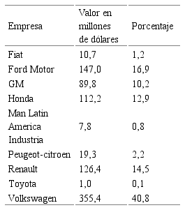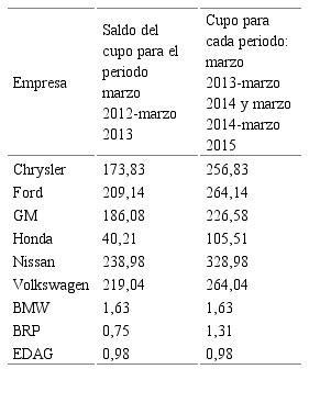 Para el caso brasileño, el Ministerio de Desarrollo, Industria y Comercio Exterior sólo menciona que las empresas que se hagan acreedoras a las cuotas de exportación hacia México deben obtener el Certificado de Cuotas para empresas exportadoras del Banco de Brasil, S.A. (DOU, 03/04/12)[15]. En el caso del primer año (periodo de marzo de 2012 a marzo de 2013), la cuota de exportación se dividió en un 20%, 60% y 20%. La primera cuota correspondiente a 290 mdd, fue repartida entre 10 empresas en partes iguales, es decir, cada empresa participó con 29 mdd: Fiat, Ford, General Motors, Honda, Iveco, Man, Mercedes-Benz, Renault, Toyota y Volkswagen (DOU, 03/04/12).