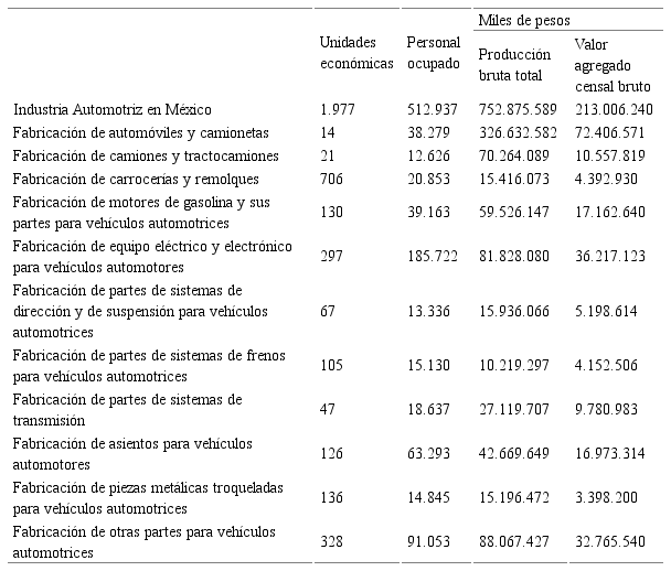 En el sector automotriz de México destaca la fabricación de automóviles y camionetas, actividad que emplea 7.5% del personal ocupado y genera 43.4% y 34.0% de la producción bruta y del valor agregado bruto total, respectivamente, del sector a nivel nacional. Así también la fabricación de equipo eléctrico y electrónico para vehículos automotores, pues en esta actividad se ocupa 36.2% de la población del sector, y se genera 10.9% de la producción bruta total y 17.0% del valor agregado censal bruto. Otra