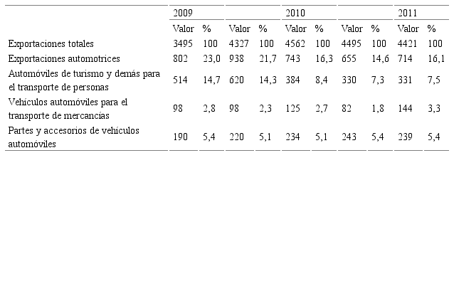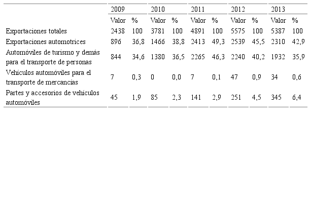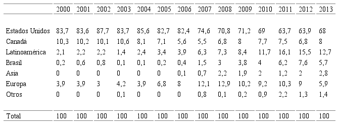 Los destinos de exportación de la producción automotriz nacional, aun cuando se han diversificado en los años recientes, todavía se concentran en gran parte hacia los Estados Unidos. En el año 2000 Estados Unidos y Canadá en conjunto recibieron 94.0% de las exportaciones totales de vehículos, Brasil apenas significó 0.2%, Latinoamérica 2.1% y Europa 3.9%. Para 2013 se apreciaron algunos cambios significativos en el destino de exportación de vehículos; Estados Unidos recibió 68.0%, Canadá 8.0%, Latinoamérica 12.7%, Brasil 5.7%, Asia 2.8% y Europa 5.9% (véase Tab 2).