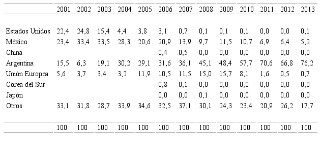 Con respecto a los vehículos ligeros, desde el 2007 el principal mercado de exportación es Argentina, en el 2013 absorbió más de 76% de la producción exportable; en tanto que México sólo recibió 5.2%. No obstante, en el año 2001, los mercados de exportación se encontraban diversificados: el resto del mundo (33.1%), México (23.4%) y Estados Unidos (22.4%), eran los principales mercados (véase cuadro 5).
