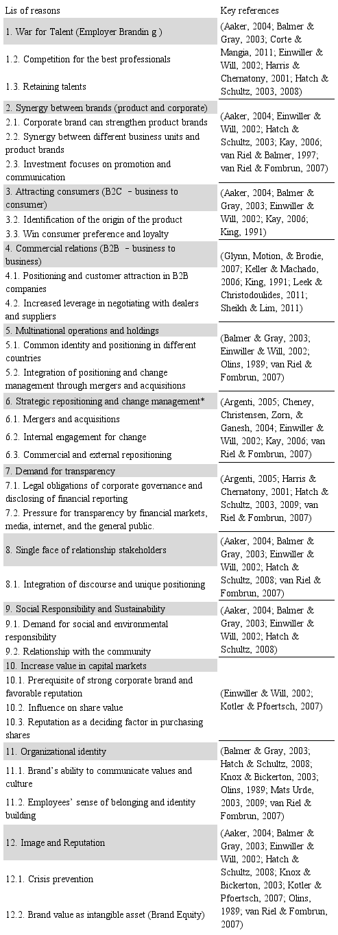 In the corporate branding literature, authors address a wide range of reasons and benefits of investing in corporate brands. After a revision (Rodrigues et al., 2014), as Table 2 shows, 26 reasons were listed and grouped into 12 main categories: war for talent (employer branding); synergy between brands; consumer attraction; commercial relations; multinationals and holdings; strategic repositioning; demand for transparency; single face with stakeholders; social responsibility and sustainability; capital market; organizational identity; image and reputation. Possible reasons are understood as expected results, perceived benefits, and market assumptions, which may be considered as relevant reasons to adopt this strategy. These reasons, grouped into categories, gave rise to the research variables used in the preparation of the questionnaire.