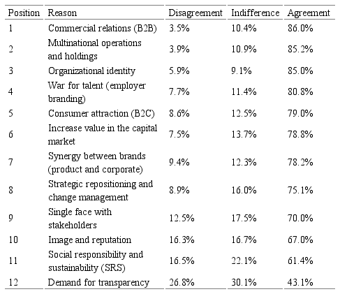 However, for the three groups the reasons "social responsibility and sustainability" and "demand for transparency" are placed at the bottom of the ranking, which is against many arguments that consider access to information and technological changes as one of the main reasons for corporate branding, along with the requirement of corporate citizenship. Therefore, it was noted that the concept of corporate branding is predominantly seen as the potential capability to project identity. External perception bias appears as one of the last reasons – image and reputation (67% agreement), way of communicating social responsibility (61.4%), and demand for transparency (43.1%). Interestingly, several studies address sustainability and social responsibility as reputation mechanisms, including in international business (Gupta & Kumar, 2013). The result becomes coherent if interpreted in the light of corporate identity, since these aspects are only valid in positioning if they are part of the organization's values, channeled by the ability to communicate its culture and essence.