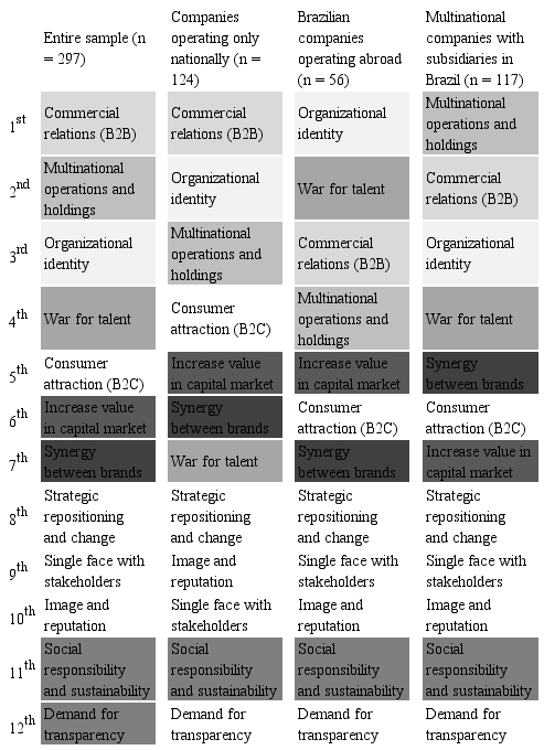 It is also interesting to note the change of perspective depending on whether the company headquarters is Brazilian or foreign. For respondents who work at companies with Brazilian headquarters, corporate branding gains greater importance due to the capability to communicate the identity locally and internationally. On the other hand, in foreign companies, the perspective of alignment in various locations stands out, with Brazil being one of them. The reason "war for talent" is also highlighted. In the group of Brazilian companies with only domestic operations it appears only in seventh place, while in the other groups it is one of the main reasons. It is interesting to note that, in these organizations, employer branding appears above consumer attraction and synergy with product brands, which indicates that corporate branding is a focus in stakeholder relationship strategies (Douglas & Craig, 2013; Ghauri et al., 2011; Xie & Boggs, 2006).