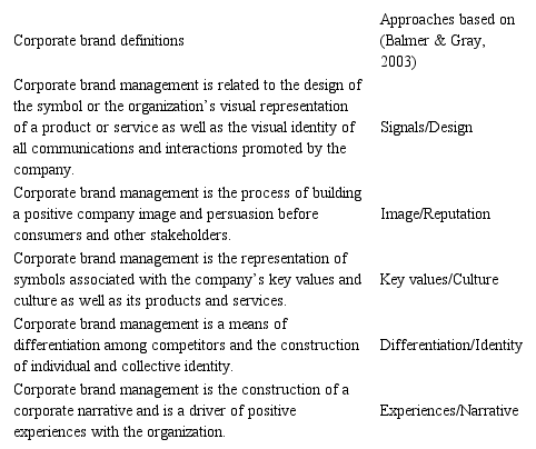 Considering the categorization of the theoretical fronts proposed, a possible grouping of five main definitions and approaches – differentiated by their specific focus – related to corporate branding was identified, as shown in Table 1.