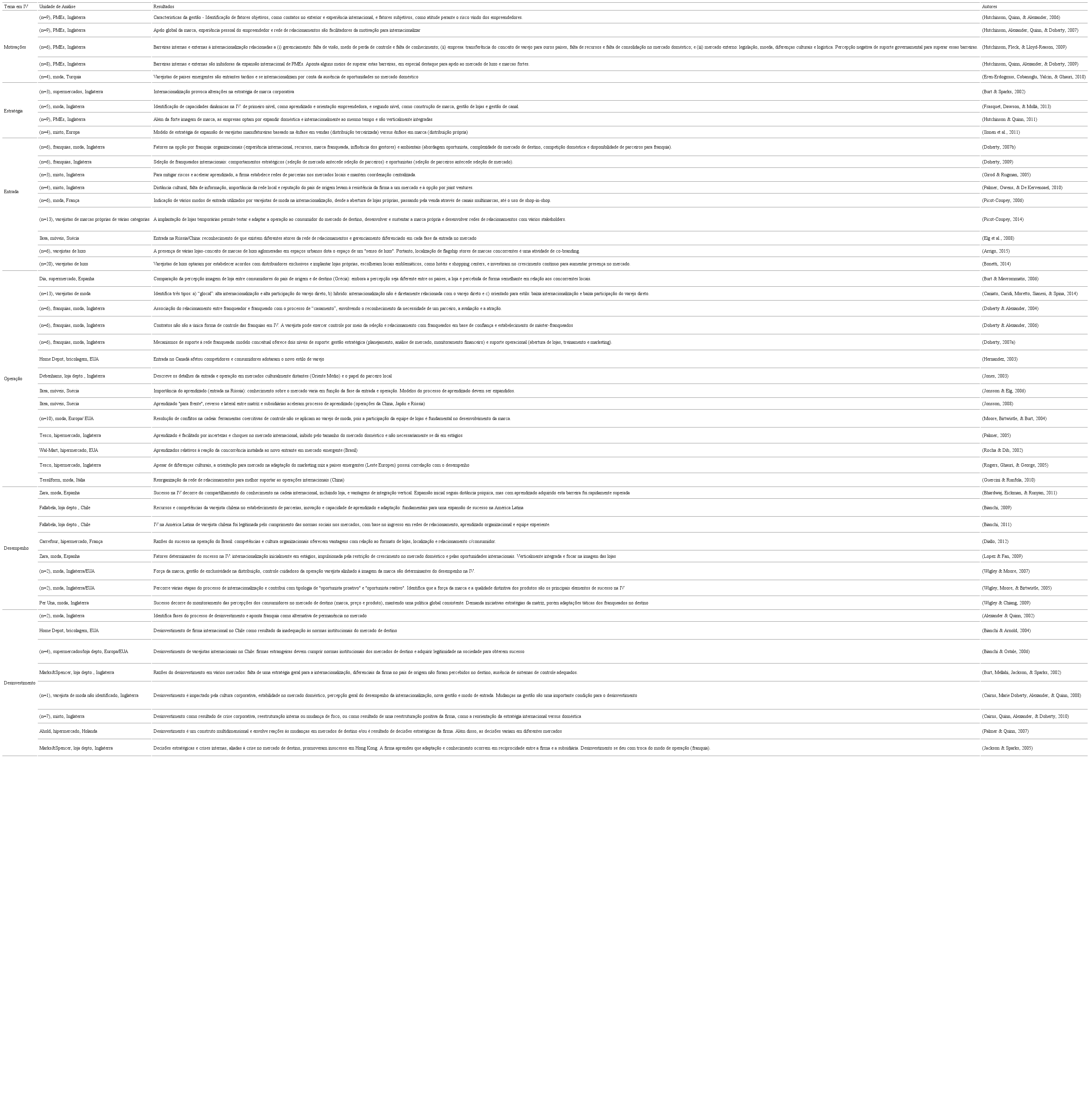Por último, os artigos foram então analisados e classificados de acordo com os principais temas de pesquisa sobre IV, segundo a organização proposta na revisão de literatura de IV elaborada por Swoboda et al. (2009): (i) motivações, (ii) estratégia, (iii) seleção e entrada nos mercados, (iv) padrões de operação nos mercados (incluindo aprendizado e adaptação) e (v) desempenho (incluindo desinvestimento). Além disso, para cada artigo foram identificados: a) número de casos, b) unidade de análise, c) ramo de atuação das firmas varejistas estudadas, e d) países/regiões de origem e de destino.