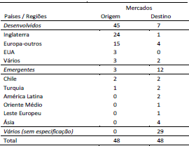 Na Tabela 2, nota-se a prevalência de estudos sobre varejistas originárias de mercados desenvolvidos, representando 45 dos 48 artigos analisados, com destaque para o Reino Unido, com 24 artigos, seguido de outros países europeus. É interessante notar a baixa participação de estudos sobre firmas oriundas dos EUA e a franca liderança de estudos com firmas europeias, conforme já apontado por Alexander e Doherty (2010). Apenas três artigos traziam estudos sobre a internacionalização de varejistas originárias de países emergentes. Com relação aos mercados de destino, em 29 dos 48 artigos não são especificados os mercados de destino, porém nota-se uma maior participação dos mercados emergentes, estudados em 12 artigos.