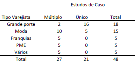Na Tabela 3, nota-se um certo equilíbrio na amostra entre estudos de casos únicos e de casos múltiplos, com 21 e 27 artigos, respectivamente, dentre os 48 selecionados. Com relação ao tipo de firma varejista estudada, 18 artigos estudaram varejistas de que operam com lojas de grandes formatos, como hipermercados e lojas de departamento e 15 artigos estudaram varejistas de moda (incluindo luxo). Franquias varejistas e pequenas e médias empresas (PME) foram objeto de cinco estudos cada.